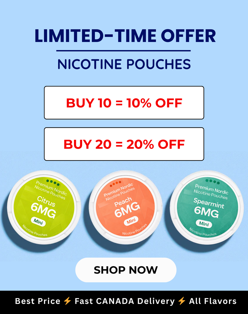 At BestPouches.ca, our mission is simple: to offer Canadians a cost-effective, tobacco-free alternative to smoking. We proudly carry one of the widest selections of nicotine pouches in the country—designed to suit all flavor preferences and nicotine needs. Whether you're new to pouches or looking for your go-to brand, our carefully curated assortment makes it easy to find the right fit for your lifestyle and budget.