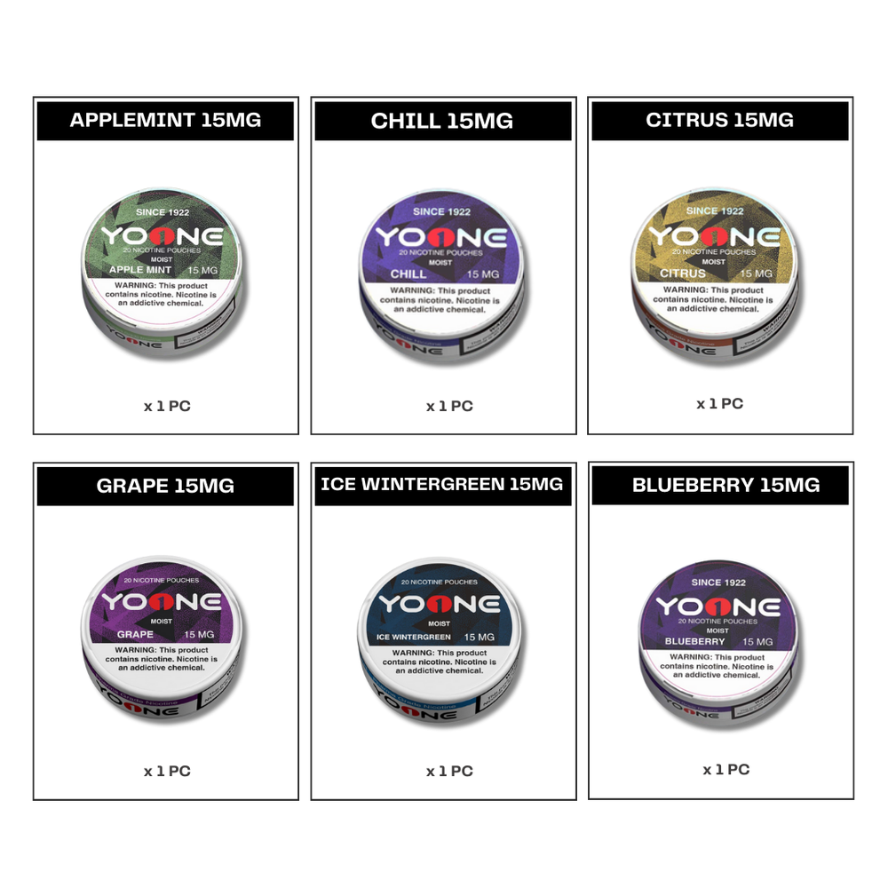 YOONE Pouches 15MG Set brings together eight of the brand’s most popular flavors in one complete bundle, offering a bold and satisfying nicotine experience for every preference. From crisp fruit blends like Apple Mint, Blueberry, Citrus, and Grape, to rich and refreshing options such as Chill and Ice Wintergreen, this set delivers a full-spectrum flavor journey with consistent intensity. Each pouch features a 15MG nicotine strength and a moist pouch format for faster release, smoother absorption, and long-lasting satisfaction. Tobacco-free, smoke-free, and discreet, YOONE pouches are designed for powerful enjoyment anytime, anywhere. Whether you’re discovering new favourites or stocking up on a high-strength essential, this all-in-one set has you covered.